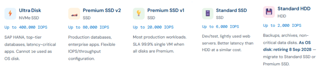 | Standard HDD | HDD | 2,000 | Backups, archives, non-critical data | ⚠ Data disk ✅ | OS disk retiring Sep 2028 |