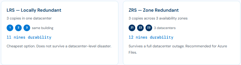 Azure always stores at least 3 copies of your data. The question is where those copies live. More geographic spread means higher durability and higher cost.